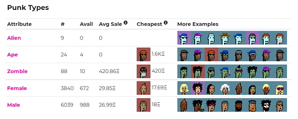 類型的稀有性:在1萬個CryptoPunks中,有9個外星人,24個猿人,88個僵尸,3840個女性和6039個男性。因此,外星人比猿人更稀少,猿人比僵尸更稀少,等等,人們相應地進行交易。因此,舉例來說,如果你看到一個看起來很奇特的僵尸比一個看起來很普通的 "地板 "男性要多賣100多ETH,這確實是有其原因的。