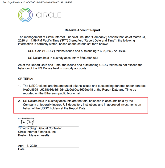 Tether作為穩定幣的“老大哥”為Circle設定了一個非常低的門檻,合法的穩定幣將為交易者提供一個更安全的地方來存儲他們的資金。USDC承諾透明度和證明,并且他們多年來一直提供每月認證,但透明度卻沒那么高。而這也證明Circle的USDC無法抗拒Tether本身所暴露的誘惑,下圖是Circle的USDC平臺的首個可用證明: