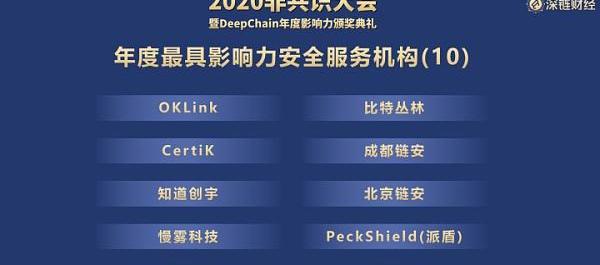 “DeepChain2020年度最具影響力安全服務機構”獲獎者:OKLink、CertiK、知道創宇、慢霧科技、零時科技、比特叢林、成都鏈安、北京鏈安、PeckShield、庫鏈科技。