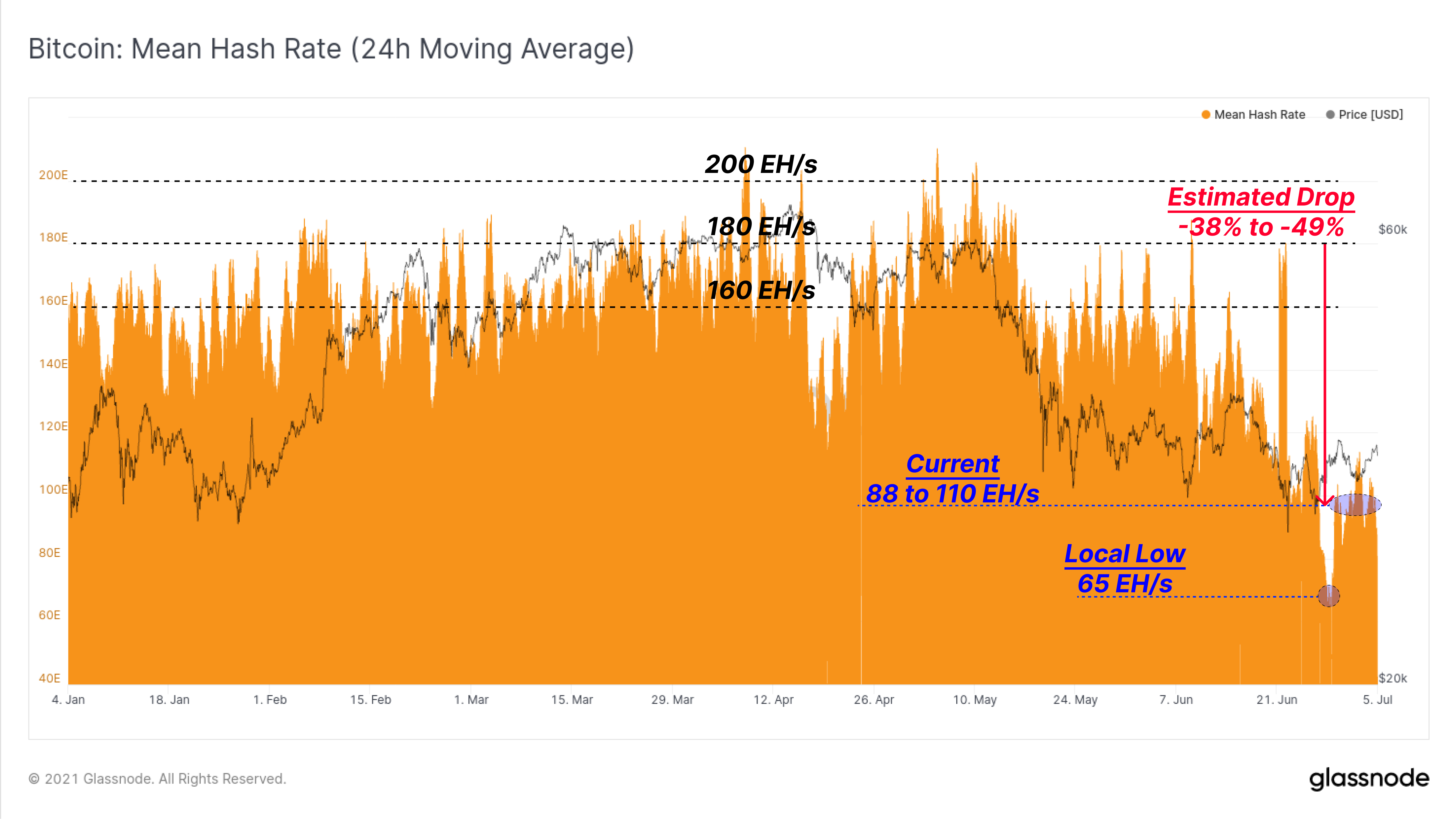 目前比特幣網絡算力已恢復并穩定在 88-110 EH/s 的范圍內,這反映出網絡算力整體下降了38% - 49%,這提供了一個衡量當前離線并受中國禁令影響的網絡算力比例的指標。
