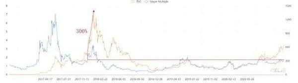 MayerMultiple倍數是通過將比特幣價格除以價格的200天移動平均值得出。根據長期歷史價格走勢來衡量比特幣的當前價格,它強調了在較長時間范圍內比特幣超買或超賣的情況。