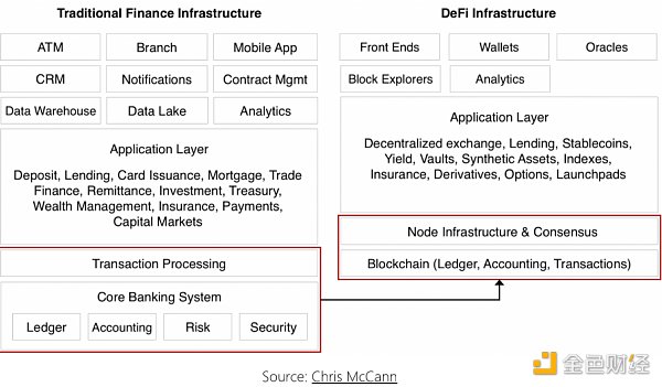 傳統金融也面對著相似的發展難題。由于進入壁壘和規模經濟的存在,垂直服務整合銀行最終能提供大多數核心銀行服務,如存款、貸款、轉賬、發行債務、建立清算所,中央銀行負責管理貨幣供應。這些服務成本高昂,因為涉及到各種實體、人工處理文件流程及復雜又相互獨立的基礎設施。