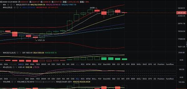 1900/1/1 0:00:00行情分析;短周期小時線來看,早間再度出現插針的行情,日內價格反彈重回在布林軌道內,行情出現了回暖跡象,短期內價格能站穩23000位置,很有反彈上行試探的可能,反之行情還將延續早間的下跌.