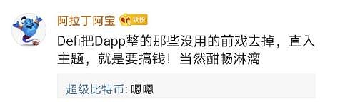 隨著Fomo情緒推動至高潮,當時的一些理性派也表達了自己的觀點。他們認為:雖然我們認為DeFi確實能帶起一輪局部性小牛市,甚至有可能成為下一輪大牛市的啟動引擎,但是也就僅此而已了。想要寄希望于DeFi來改造、革新乃至顛覆金融行業,目前道路尚遠,修行尚淺。且文中已經客觀的分析了DeFi所面臨的性能瓶頸、安全風險以及CeFi阻隔等現階段依然面臨的問題。更直白的批評聲音稱DeFi就是套利游戲,演繹了人性的貪婪和資本永不眠。