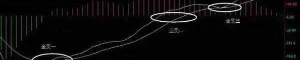 金叉1:當黃線和白線都在零線以下,白線向上穿過黃線時,表明股市即將轉強,股價回落止跌朝上,可以買進股票或持股,這是MACD指標“黃金交叉”的形式一。