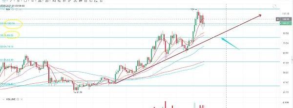 LTC走勢也比較強,大概的支撐位在86與100美金,特備在86的位置有一條特別重要的趨勢線,需要特別關注。如果能夠在趨勢線上方運行,那么后期就有望繼續往上爬升,如果跌破,那么可能會比較慘。