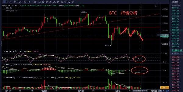小時圖分析,大餅今天早盤是橫盤震蕩。目前K線在22600附近運行。技術上布林帶縮口向下,K線在中軌線下方運行,中軌線形成壓制。幅圖MACD快慢線在0軸線下方,多頭量能柱慢慢縮短。KDJ三線開口向下,VOLUME成交量放大。綜合各個技術指標看,短期反彈繼續看空。