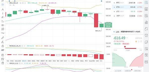 ETH今天繼續回調,跌幅超過5%,日內低點跌至MA30附近,均線依舊是向上的,上漲趨勢尚未完全扭轉,但是日線MACD雙線有形成死叉的跡象,若再度形成死叉,則未來可能再度形成頂背離,兩次頂別離,對趨勢的破壞作用就非常明顯。所以近期重點關注586位置,也是MA30位置的支撐和阻力作用。