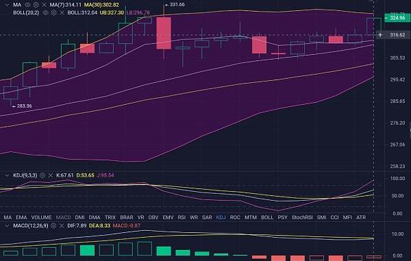 技術面上來看,和之前分析一樣,大盤的帶動給BCH的動能帶來了一波新的生機,目前跟隨著大盤繼續頂部的震蕩趨勢,布林帶開口向上打開,處于MA30中軸的位置運行,短期的反轉動能還是比較的弱勢,4小時的k線走勢處于雙頂排列姿態,日內大概率會繼續震蕩小幅周期上漲。