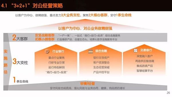 此處的“3+2+1”對公經營策略具體指重點發力3大業務支柱(行業銀行、綜合金融、交易銀行)、2大客群(攻堅戰略客群、拓展小微客群)、1條生命線(審慎經營)。