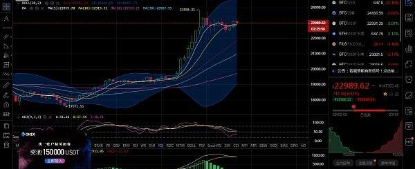 在從四小時K線圖中來看:當前布林帶通道呈現于上行有收口的跡象,K線價格位于在布林帶中上軌道內運行當中,MACD空頭能量柱正逐步放量,MACD快慢線在零軸上方呈現于粘合有拐頭向下的跡象,KDJ在50水平線附近呈現于交叉下行趨勢,RSI在50水平線上方呈現于粘合有拐頭向下的跡象,日內關注下方22350以及22000一線,上方優先關注23500一線。