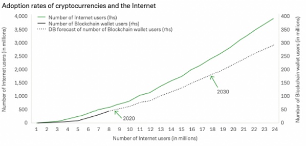 下圖的綠線代表互聯網人口,灰線代表2021年7000萬的比特幣規模,虛線是德意志銀行的預測,可以看出發展速度非常快,這還不是CBDC的錢包,只是比特幣的錢包。