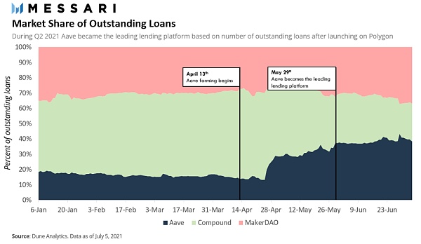 在Polygon的推出和大量代幣激勵的推動下,Aave在4月份未償還貸款總額中的市場份額大幅上升,與Compound形成了競爭。截至5月底,Aave取代Compound成為領先的借貸平臺,占據了DeFi總借貸市場的37%以上。