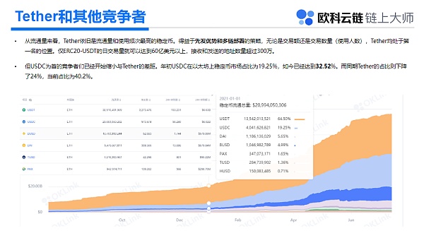 歐科云鏈《2021數字資產半年報》顯示:截至7月1日,以太坊上的穩定幣流通總量達776億美元,其中USDT、USDC、BUSD、DAI以及TUSD是流通量前五的穩定幣,流通量均在10億美元以上,共計占據95.5%的市場份額。
