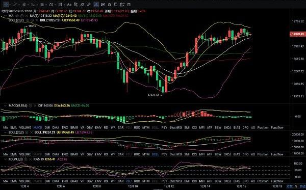 4小時級別上看,早間價格強勢上沖,打破攻擊線與防守線的層層壓制,測試布林上軌的壓制力度,最高觸及19570附近后承壓下行,回測20日均線支撐,價格重回攻擊線上方。布林通道開口,攻擊線與防守線均偏向上行,價格點逐漸拉高,附圖指標向下放量。價格整體還是一個區間盤整,可以考慮區間內高拋低吸。
