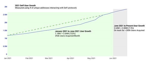 用戶增長(地址增長)保持相對穩定,從4月份的18%到5月份25%,環比增長略有放緩。6月份,用戶增長有望達到約12%。高用戶增長對持有者來說可能是一個看漲的指標,因為它是采用的關鍵指標,也是識別是否存在邊際Token買家的關鍵指標。雖然總用戶數的增長仍然強勁,但增長的百分比曲線正在趨于平緩。