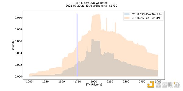 除此之外我們也可以看出目前 0.05% 費率和 0.30% 費率的 ETH 對穩定幣的 LP 池子資金分布基本相同。但是 1.00% 的池子資金卻比較集中,主要在 $1790-$1850。