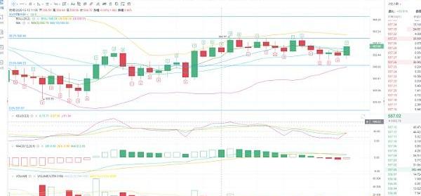 日內以太一直處于緩步上升的趨勢,不過并不強勢,上方最高來到560上方,但都迫于壓力位而又迅速的下跌到560下方,目前在557位置