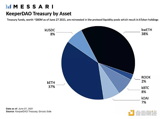 重要的是,這些 MEV 利潤的一部分將被發送至 KeeperDAO 的「Treasury」(協議金庫) 中。這意味著,隨著參與進來的 keepers 的盈利能力的提升,Treasury 也將增長。截止 6 月 27 日,KeeperDAO 的 Treasury 中共計有 600 億美元,這些資金的組成方式如下圖所示: