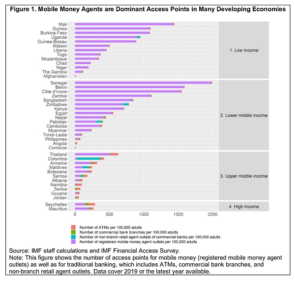 首先,在一些中低收入國家,移動貨幣比傳統銀行服務目前更容易獲得。移動貨幣是一種由移動貨幣代理網絡帶給客戶的服務,而發展中經濟體的銀行通常依賴實體分行和自動取款機。在過去十年左右的時間里,銀行還提供了“代理銀行業務”以擴大銀行服務范圍。盡管銀行進行了此類創新,但在許多低收入和中等收入國家,移動貨幣代理人的數量仍高于自動取款機、商業銀行分行和非分行零售代理人的總和(圖1)。