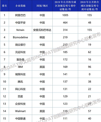 在IPRdaily表格中,中國聯通位列第15,2019年公開的專利申請達到111件。在2019年9月26日,中國聯通官方微博:截至2019年9月26日,中國聯通以212項#區塊鏈#專利排名中國第二位,僅次于阿里巴巴。11月20日鏈塔智庫的報告中統計顯示,中國聯通已申請233件區塊鏈專利,且皆為發明專利。