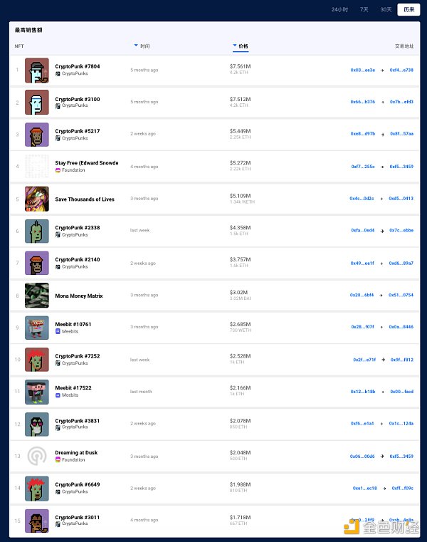 歷史上交易價格最高的NFT 數據來源:dappradar