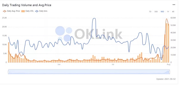 與此同時,NFT的數字收藏品市場的交易量和平均價格均攀升至創紀錄高點。有著“NFT 亞馬遜之稱”的OpenSea僅在8月2日當天處理的市場交易額就超過了2020年全年交易額。根據Dune Analytics數據顯示,截止8月9日,OpenSea 8月NFT市場累計交易量達5.47億美元,較7月整月交易量增長68%。根據Cointdesk消息,7月以太坊NFT的交易額達到1.71億美元,比上月同期增長338%。