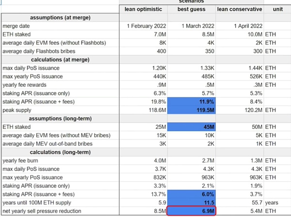 在這張電子表格中,他完成了一些關于ETH在合并后的以太坊網絡上的供應回報和銷毀率的粗略計算。這很有啟發性。