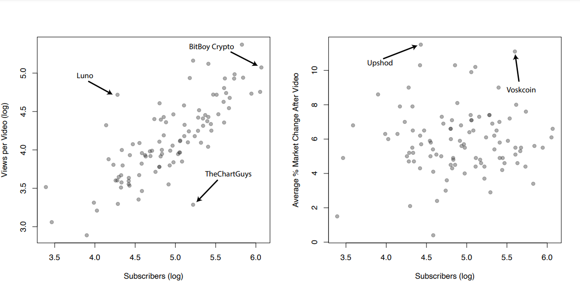 圖4的左邊部分列出了所分析的100個頻道中每個頻道的訂閱者數量與每個視頻的平均瀏覽量。右側部分的數據則顯示了用戶數量與視頻中提到的代幣在播出后48小時內的平均回報率的對比。雖然訂閱者數量和每個視頻的瀏覽量之間有很強的相關性,但僅僅因為一個YouTuber的訂閱者和瀏覽量高,并不一定意味著他們的視頻會先于市場走勢。