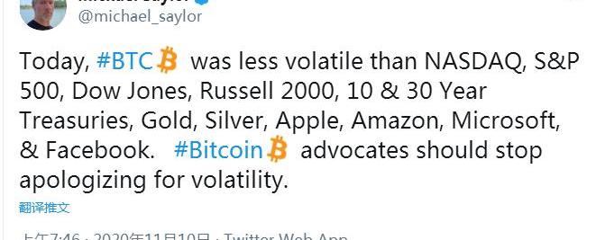 下跌并沒有讓比特幣支持者動搖信心,MicroStrategy創始人表示,“比特幣今天的波動率低于納斯達克、標普、道瓊斯、羅素2000指數、10年和30年國債、黃金、白銀、蘋果、亞馬遜、微軟、臉書。比特幣布道者不必為比特幣的波動性而抱歉。”