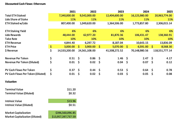 使用這些參數,我們可以計算出LDO的內在價值為13.96美元,這意味著它的流通市值為3.96億美元,FDV為139億美元。