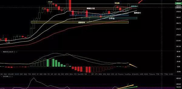 昨天明確提到,價格一旦修復趨勢線#1,將向上挑戰436。當前,價格正在謀求對中位線的向上沖擊。