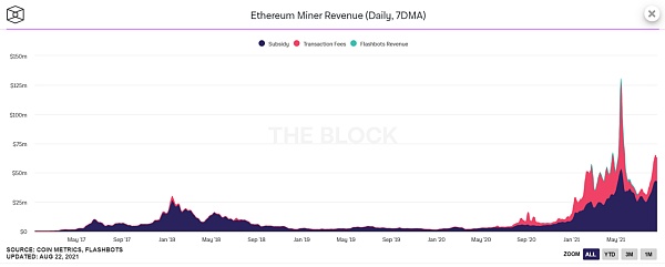 以太坊礦工收入結構,區塊獎勵是大頭,手續費占比有提升趨勢