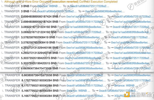 在本次攻擊中,黑客前后進行了多輪測試和攻擊,總共的獲利超過13000個BNB,市值超過500萬美元。在黑客發起的眾多輪測試和攻擊中,我們選取了一次很簡單的攻擊流程和大家展示一下黑客攻擊的過程。
