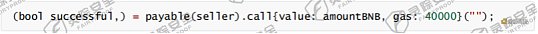 這一行代碼中,在外部調用時,通常 call 調用默認只有2300 gas可用,無法完成一次攻擊。但這里使 用 gas: 40000 的參數, 使得重入攻擊最多有40000 gas可用,這就使得重入攻擊得以完成,漏洞就出 現了。 另外,合約的狀態修改是在外部調用之后,從而導致重入攻擊發生時 require(_balances[seller] >= tokenAmount 這句語句中的 balances[seller] 沒有被修改。因此攻擊者可以在重入時繼續調用上面 的代碼,轉走合約中的BNB。
