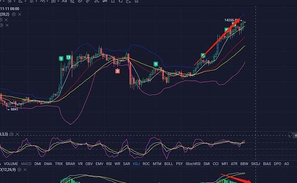 ???從一小時來看,布林帶呈開口狀態,幣價從布林帶下軌一路高歌猛進運行至布林帶上軌達到年內新高14255后出現回踩,進入一個高位修復盤整狀態,附圖MACD中快慢線在零軸上方形成金叉后持續向上散發,但量能開始縮短,整體來看,預計短期有會一個小幅度回踩,建議回踩后做多為主,可以關注一下13800一線支撐為,破位后看向13700附近。