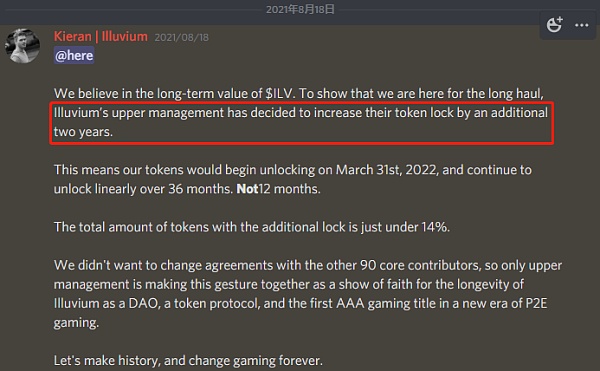 Illuvium海外社區的維護和活動運營,Twitter時不時發布的新怪獸Demo都有傳統游戲大廠認真做事的風格。近期其團隊還宣布將高管的代幣增加2年的鎖倉周期,體現了團隊對該項目的信心。
