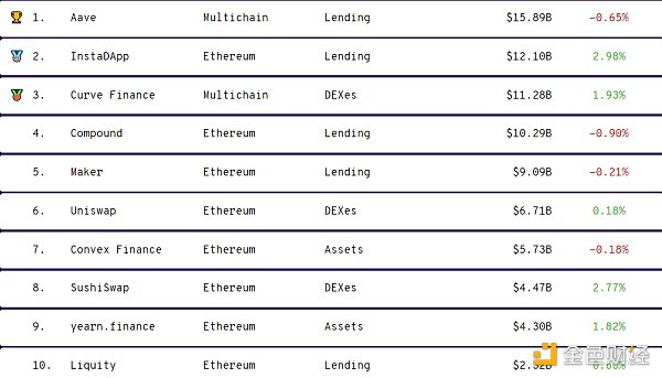 DeFi排名前十鎖倉量 數據來源:DeFi Pluse