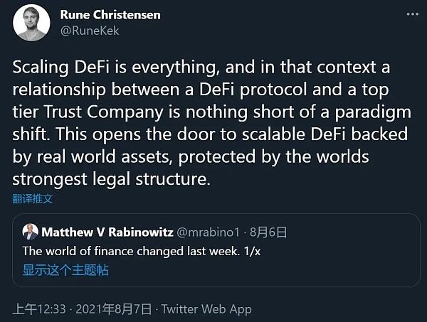 MakerDAO 創始人 Rune Christensen 在談及現實世界資產支持的DeFi 時,就認為這是一種“范式轉變”,稱其為現實世界資產支持的可擴展 DeFi 敞開了大門,同時使 DeFi 受到了世界上最強大的法律結構的保護。