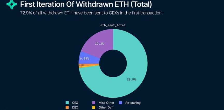 上面的圖表顯示了被提取的ETH被發送到哪里的第一次迭代的細分,這讓人們了解了提款者用他們的ETH做了什么,并有助于衡量提款者立即或短期內的一些拋售壓力。