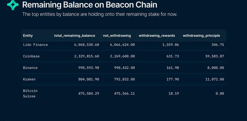 如上表所示,大多數實體目前都持有其剩余余額。Lido仍然是擁有最大數量ETH的實體,并且幾乎占信標鏈上所有質押ETH的三分之一。Coinbase是取款隊列中最大的實體,正在提取約2.58%的ETH。