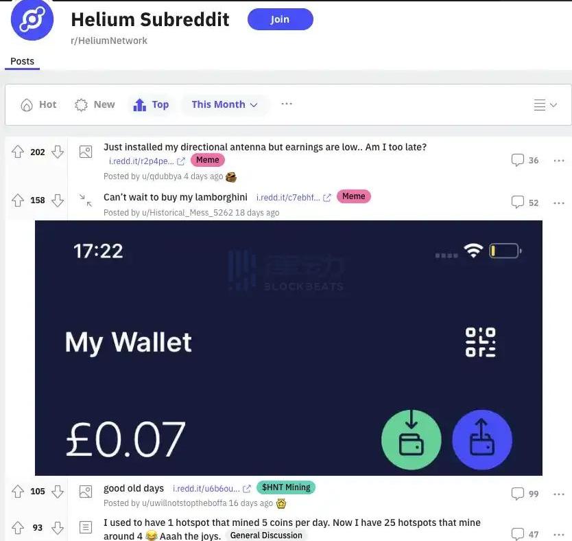 不僅如此,在Helium的Reddit社區看能到越來越多有關Helium回報率慘淡的言論。他們平均花費400-800美元購買了一個礦機,總礦機銷售額超2.5億美元,節點們希望每個月能夠獲得100美元的回報。然而事實是單節點單礦機目前的月收入僅有20美元。