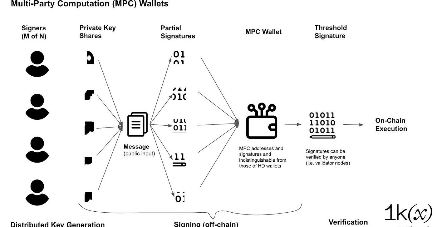 MPC錢包使用閾值簽名方案(TSS)來創建一個私鑰的份額。它們旨在通過要求多方共同創建私鑰片段然后驗證交易來提高安全性。最重要的是,在賬戶創建、使用、保存、備份和恢復過程中,私鑰不會出現在任何過程。