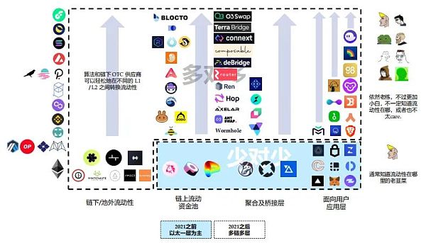 多鏈 / 多層中期未來將迎來跨鏈跨層解決方案的大規模爆發。假設終端用戶對多平臺資產感興趣,那么單個 DEX 的「本地最大」市場份額將變成「全球之一」 市場份額,這種新范式有利于「多對多」格局的形成。對聚合器及面向用戶端的應用而言是利好。