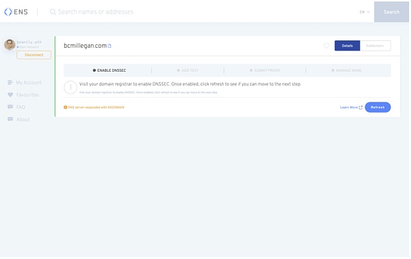 在這一點上,返回你的域名在ENS管理器應用程序的頁面,檢查并查看你的新TXT記錄和DNSSEC設置是否已經通過。這個過程可能需要幾個小時,所以如果你沒有立即看到結果,不要擔心。