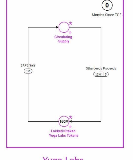 在這個假設的圖表中,我們可以觀察到幾個事件正在發生。每個月,500萬個APE代幣通過預定的代幣解鎖和質押獎勵進入流通。此外,我們可以看到每個月有1,000個APE代幣通過在Yuga的手機游戲中出售SewerPassIAPs被轉移回到$APE儲備庫中。