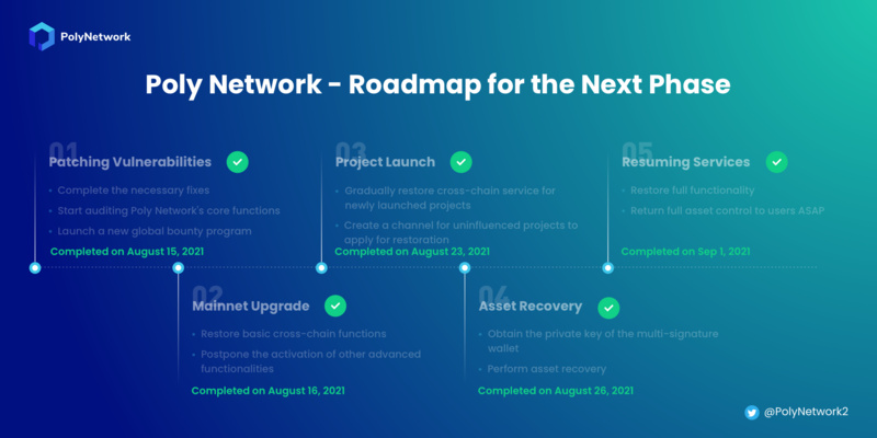 完成修復系統漏洞并公布新安全方案; https://twitter.com/PolyNetwork2/status/1426819500263890946