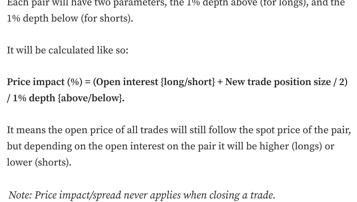 Spread是開倉時需要付出的額外滑點。對于預言機定價而言,其滑點應該根據預言機來源的交易對的深度而動態調整,使得在場外操縱價格的成本始終高于在場內的盈利。所以Spread正相關開倉規模和場內OI影響,而負相關于場外現貨深度。公式參見下圖