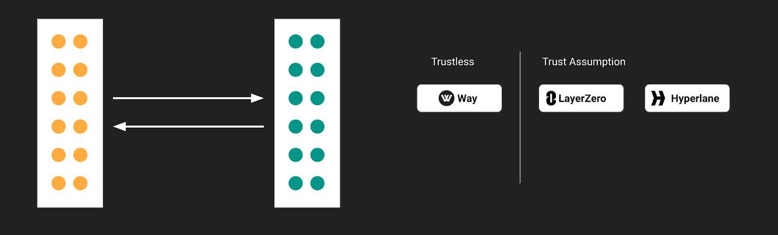 而原生驗證中的LayerZero和Hyperlane主要強調Sender和Receiver兩個客戶端的作用,弱化Relayer和Oracle。這里存在以下幾個問題:第一,用戶必須相信Relayer和Oracle不會合謀作惡;第二,用戶就必須相信協議本身不會在Relayer環節作惡。也就是說,在當前所有解決方案里無法實現TrustlessSecurity。單點故障和局部故障就像一顆不知道什么時候會爆炸的炸彈,安置在有天然缺陷的跨鏈通信方案里。