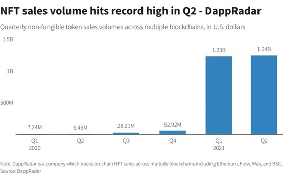 NFT市場隨著去年DeFi Summer之后出現了井噴式的發展,市場總體交易規模從去年上半年的1370多萬美金,增長至現在上半年接近25億美金的市場。另外,根據 NFT 交易的 NonFungible 數據,今年第一季度有 7.3 萬名 NFT 買家和 3.3 萬名 NFT 賣家。
